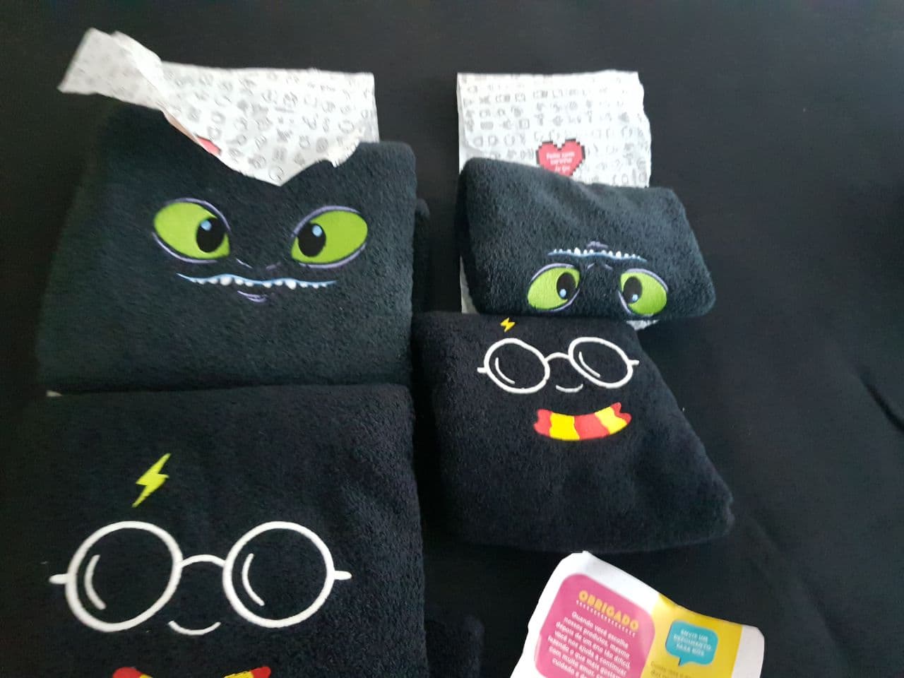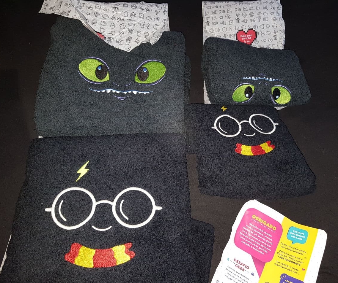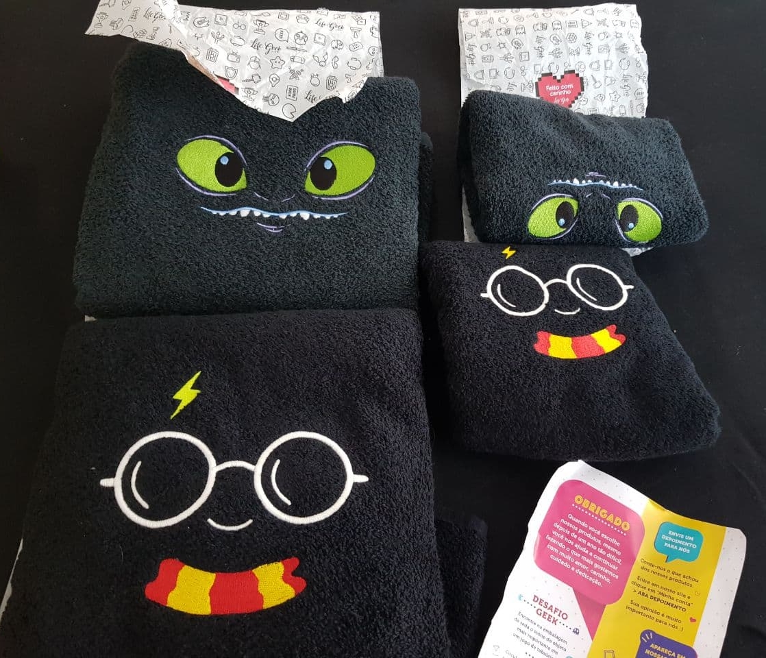 Daí comprei uma de banho e uma de rosto do Harry e bom.. eu já estava comprando, né? Então, mais uma de banho e mais uma de rosto de Como treinar seu Dragão. Porque você precisa de pelo menos duas toalhas na vida, certo? Ps.: a do dragãozinho não é fluorescente.